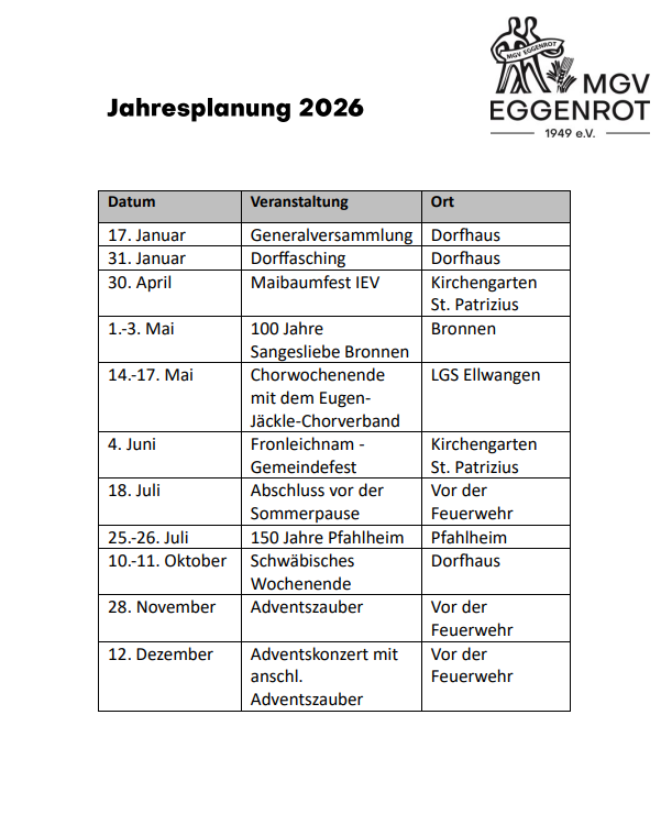 Das Jahr 2024 war für den Männergesangverein Eggenrot ein ganz Besonderes: Der Verein blickte auf eine lange Tradition des gemeinsamen Singens zurück und feierte sein 75-jähriges Bestehen. In diesem Rahmen fanden das Jahr über verschiedenste Veranstaltungen statt, um das Jubiläum gebührend zu feiern.
